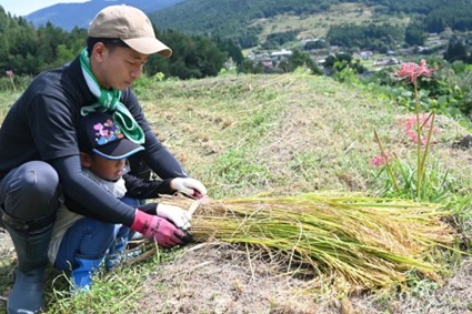 SDGsの一環として稲刈りなど棚田保全活動を支援。