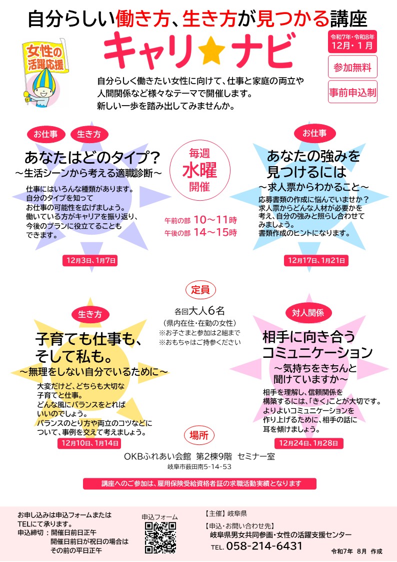 | 内容 | ◇あなたはどのタイプ? ~生活シーンから考える適職診断~ 2025年 12月 3日(水) 2026年 1月 7日(水) ◇子育ても仕事も、そして私も。 ~無理をしない自分でいるために~ 2025年 12月 10日(水) 2026年 1月 14日(水) ◇あなたの強みを見つけるには ~求人票からわかること〜 2025年 12月17日(水) 2026年 1月21日(水) ◇相手に向き合うコミュニケーション ~気持ちをきちんと聞けていますか~ 2025年 12月24日(水) 2026年 1月28日(水) ○ナビゲーター 岐阜県男女共同参画・女性の活躍支援センター キャリアカウンセラー |