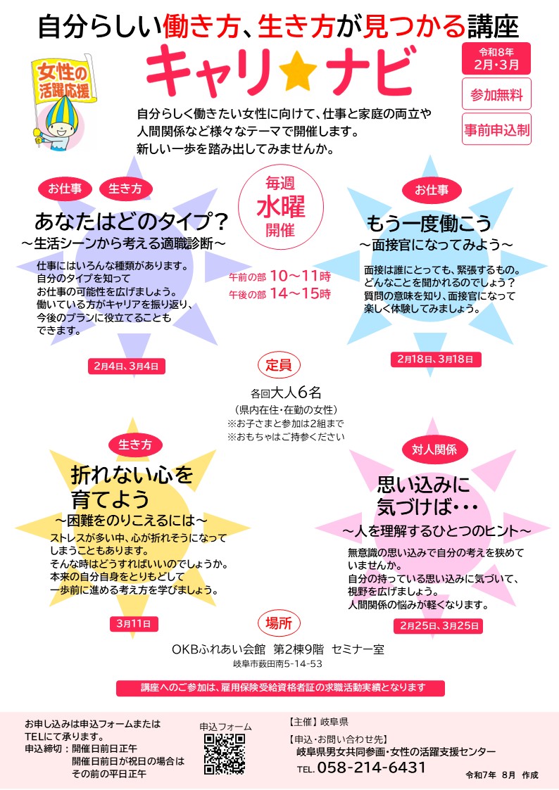 | 内容 | ◇あなたはどのタイプ? ~生活シーンから考える適職診断~ 2026年 2月 4日(水) 2026年 3月 4日(水) ◇もう一度働こう ~面接官になってみよう~ 2026年 2月 18日(水) 2026年 3月 18日(水) ◇折れない心を育てよう ~困難をのりこえるには〜 2026年 3月 11日(水) ◇思い込みに気づけば・・・ ~人を理解するひとつのヒント~ 2026年 2月 25日(水) 2026年 3月 25日(水) ○ナビゲーター 岐阜県男女共同参画・女性の活躍支援センター キャリアカウンセラー |