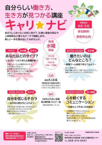 | 内容 | ◇あなたはどのタイプ? ~生活シーンから考える適職診断~ 2026年 4月 1日(水) ◇自分を信じるチカラ ~自己効力感を手に入れよう~ 2026年 4月 8日(水) 2026年 5月 13日(水) ◇働きたいのはどんなところ? ~推理ゲーム感覚で考えてみよう〜 2026年 4月 15日(水) 2026年 5月 20日(水) ◇心を軽くするコミュニケーション ~多様な人づきあいの対処法~ 2026年 4月 22日(水) 2026年 5月 27日(水) ○ナビゲーター 岐阜県男女共同参画・女性の活躍支援センター キャリアカウンセラー |
