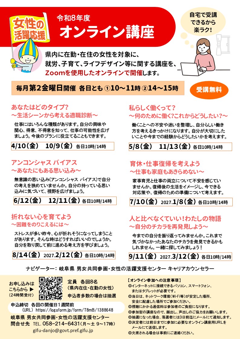 | 申込方法 | チラシ裏面の申込フォーム、又はこのページ上記の「お申し込みはこちら」のURLにてお申し込みください。(24時間受付) お問合せ先:岐阜県男女共同参画・女性の活躍支援センター TEL 058-214-6431(月~土9時~17時) |