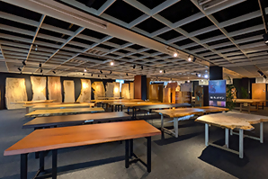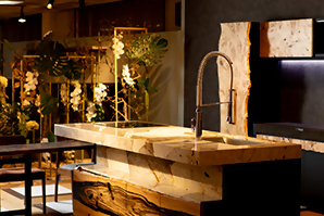岐阜には国内で流通する銘木の約6割を扱う全国一の市場があり、日本中から質の良い銘木と経験豊富なバイヤーが集まります。こうした地の利も生かして銘木を仕入れ、一点物の造作で空間全体の木質化を提案してきました。レストランのテーブル、ホテルの調度品、ショールームの内装など、今では国内外からの様々なオーダーにお応えしています。