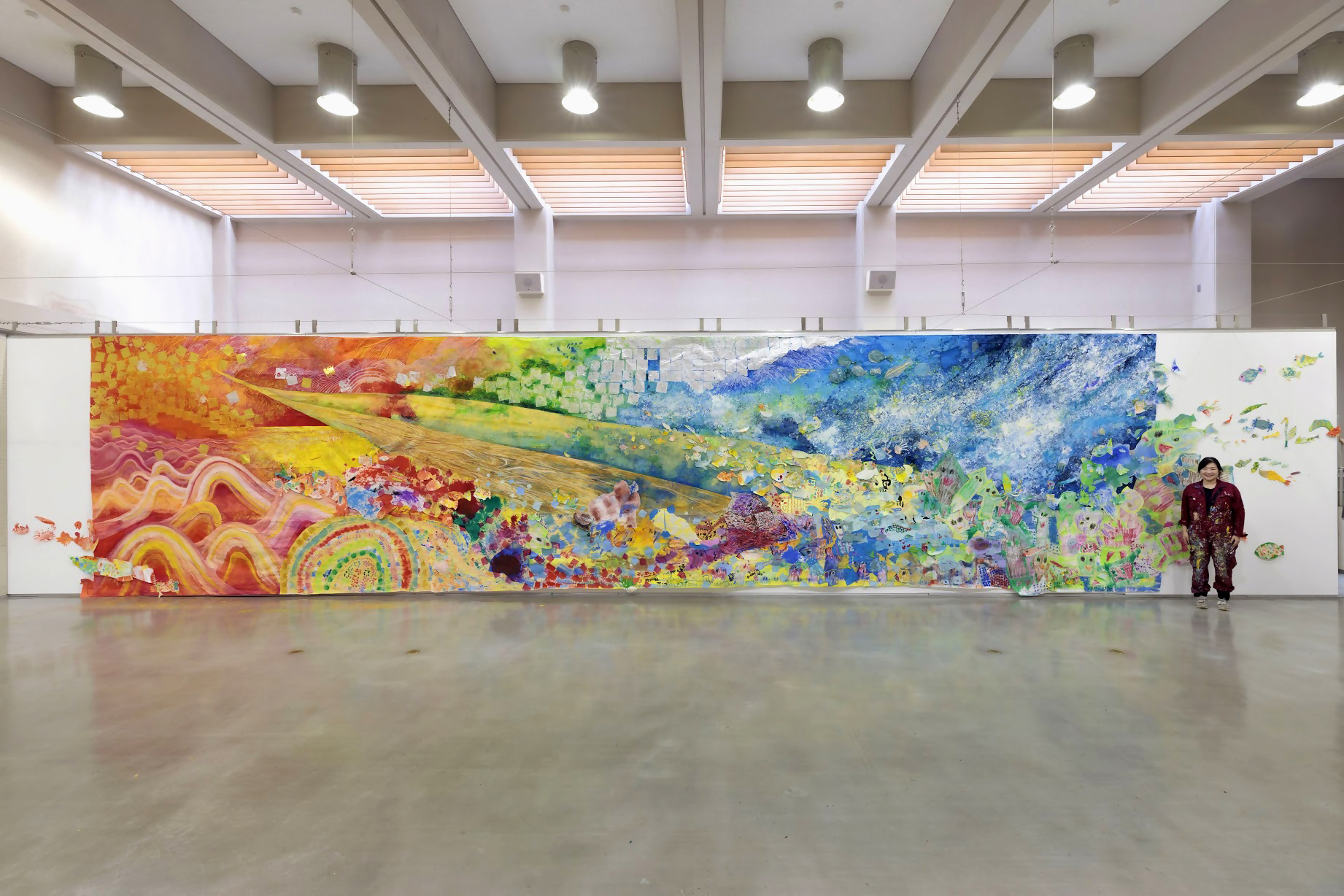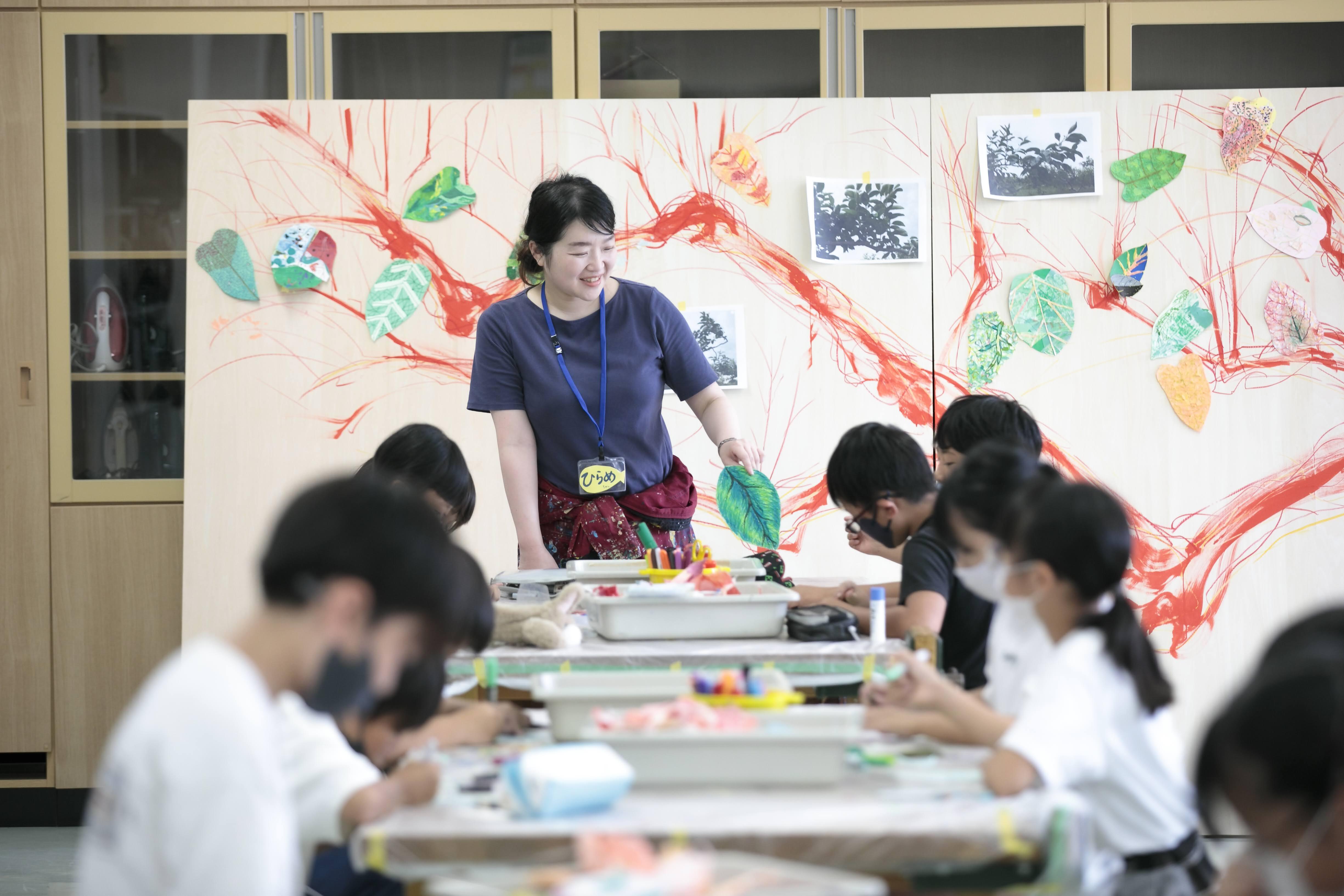 2023年には、岐阜県瑞穂市20周年事業の一環で作品制作をしました。瑞穂市は私の出身地ということもあり、私の母校である牛牧小学校の全校生徒約740名と一緒に大きな絵を制作しました。約1か月間、小学校の図工室をアトリエとしてお借りし、毎日通いながら全クラスへ授業をしました。休み時間や昼休みも一緒に活動をしながら、瑞穂市の名産である富有柿をテーマにした作品を作りました。子どもたちと協働で作り上げたこの作品は、瑞穂市の「ココロかさなるCCNセンター」に常設作品として展示されています。